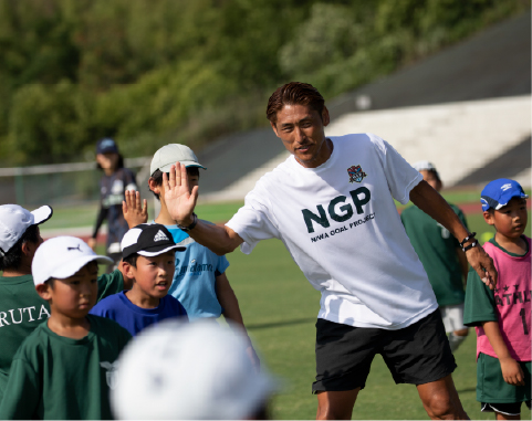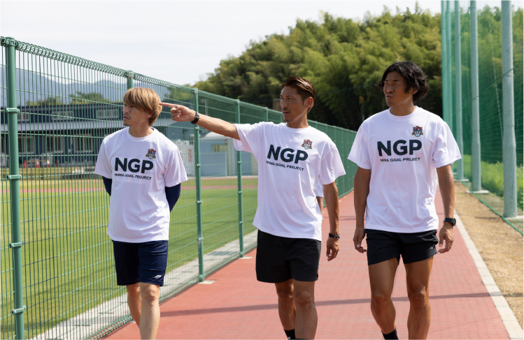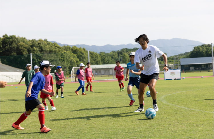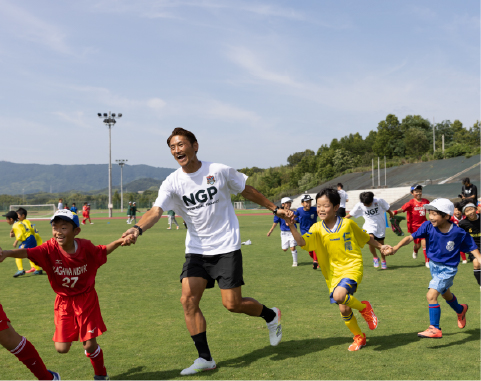 NIWA GOAL PROJECT の活動として、丹羽大輝選手は、昨年のGOAL PROJECT にも賛同していただいた新潟アルビレックスの千葉和彦選手とともに、香川県三豊市にあるカマタマーレ讃岐の練習場「宝山湖ボールパーク」を訪れました。現役カマタマーレ讃岐の川西翔太選手とも現地で合流し、サッカー教室を開催しました。当日は晴天に恵まれ、青空の下、多くの子どもたちと保護者の皆さまにご参加いただきました。小学生約130名が競技場に集まり、
