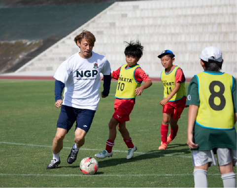 選手からの挨拶のあと、丹羽選手の掛け声でサッカー教室がスタートしました。ウォーミングアップでは、選手たちのリフティングや浮き球のパス交換を間近で見た子どもたちが歓声を上げ、プロ選手の高い技術に目を輝かせていました。サッカー教室では、シュートゲームや 3 つのコートを使ったミニゲームなどを行い、子どもたちはプロ選手と一緒に思いきりプレーを楽しみ、終始笑顔があふれていました。