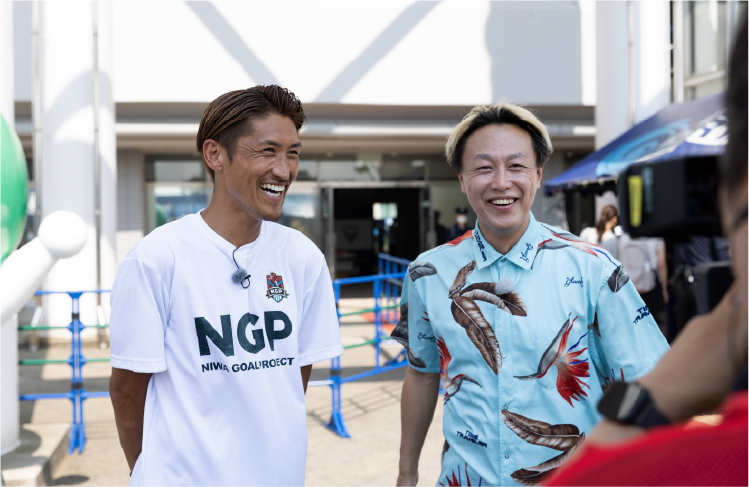 NIWA GOAL PROJECT の活動として、丹羽大輝選手は同い年でもあるお見送り芸人しんいちさんとともに、徳島県鳴門市にある古巣・徳島ヴォルティスのホームスタジアム、鳴門・大塚スポーツパーク ポカリスエットスタジアムを訪問しました。 当日は夕方から徳島ヴォルティス対藤枝MYFC戦が行われる日で、スタジアムでは「NIWA GOAL PROJECT」スペシャルイベントとして温かく迎えていただきました。 イベントでは、お見送り芸人しんいちさんのライブが行われ、
